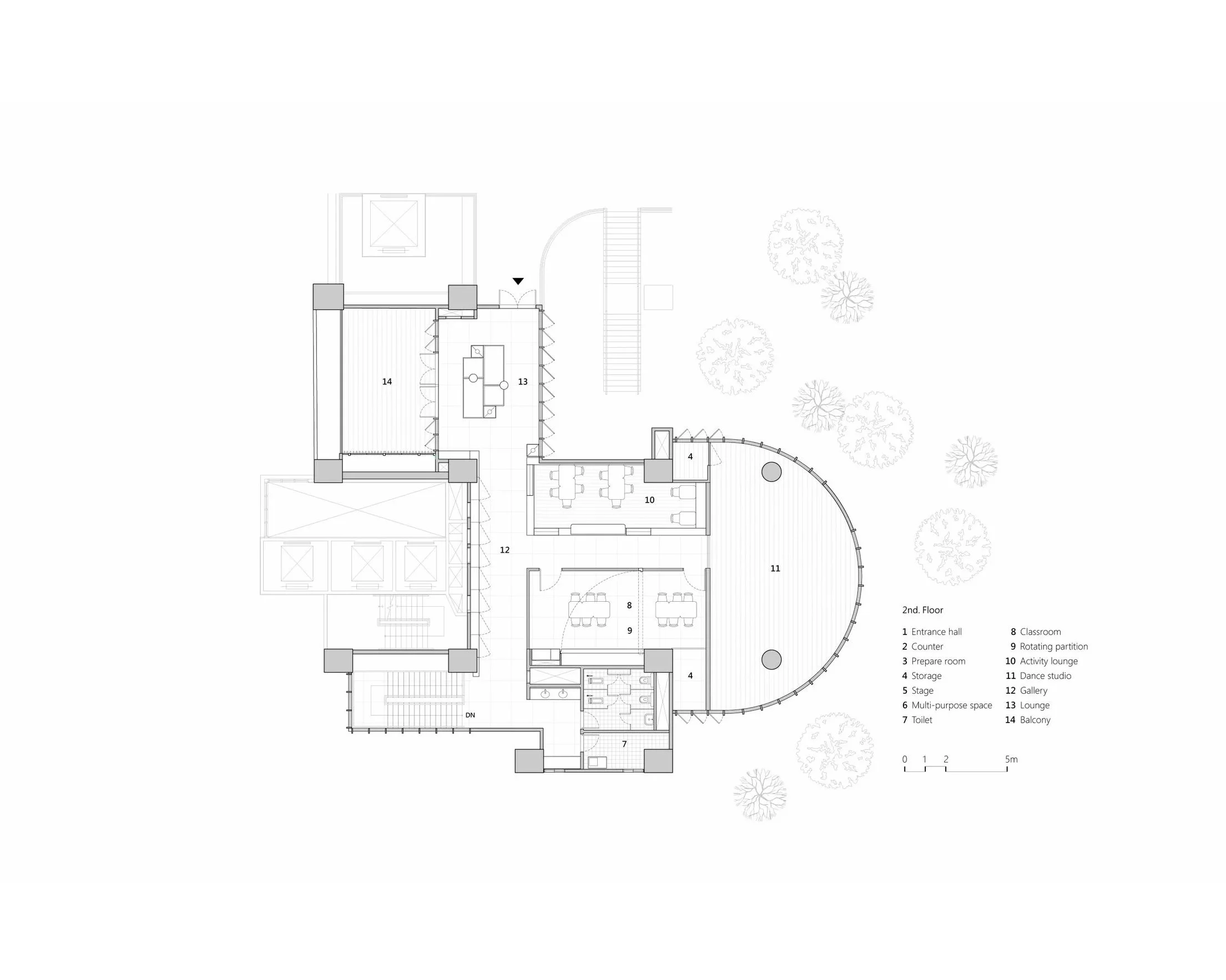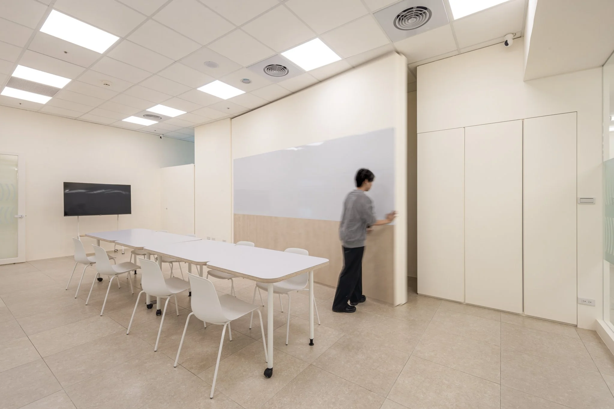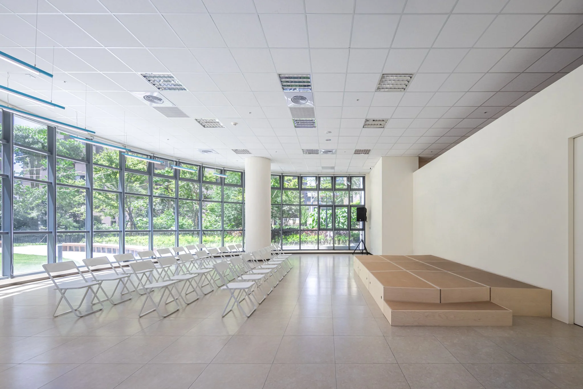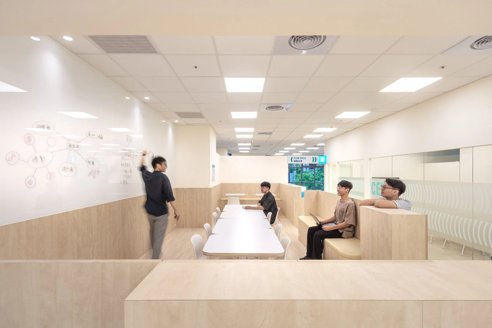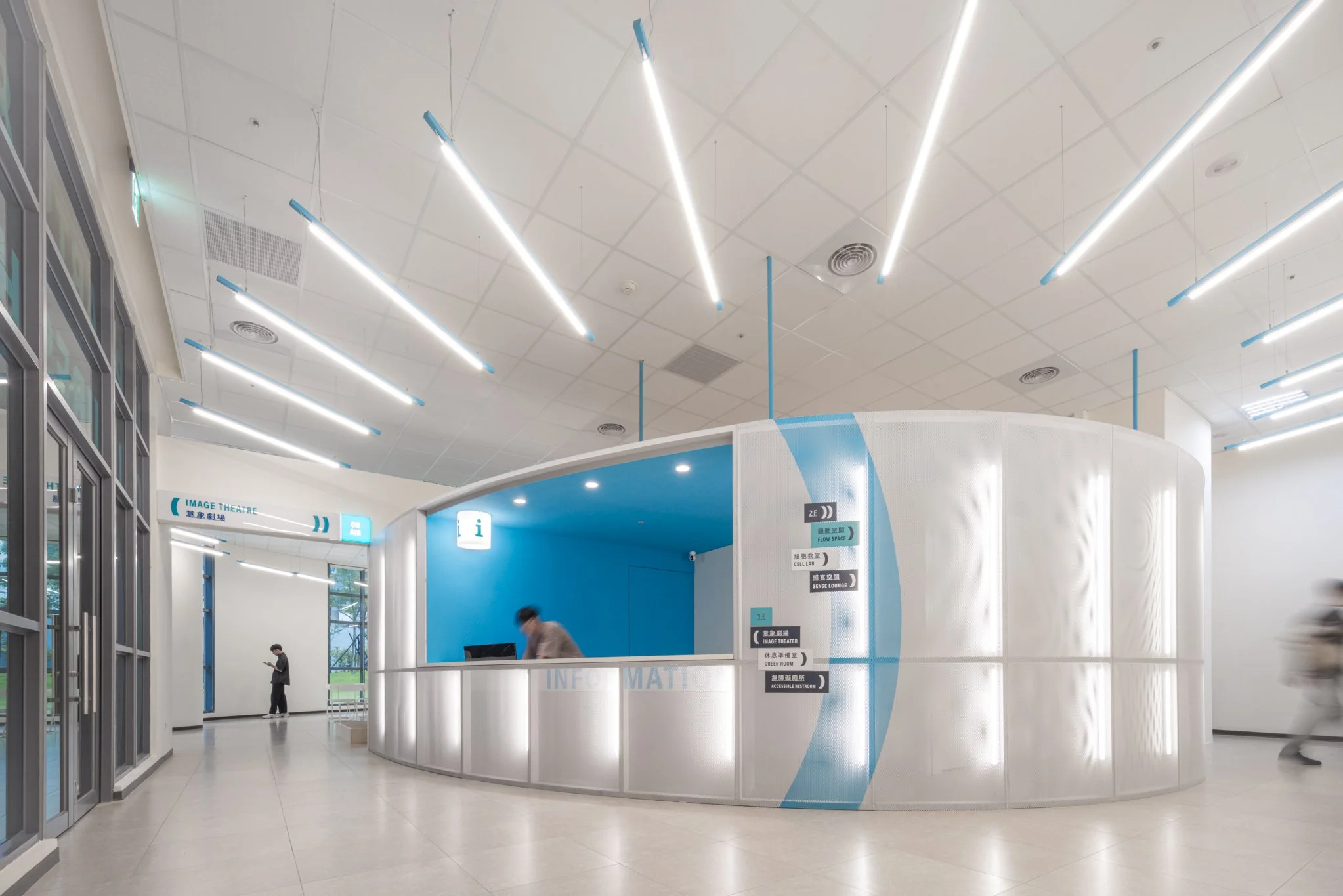 設計策略以建築外觀的圓弧語言延伸至室內,使一、二樓的活動自然映射到帷幕立面,成為建築表情的一部分。接待櫃檯以弧形姿態迎接到訪者,二樓則規劃為創課教室、彈性教室、舞蹈教室與公共休憩區,提供多元學習與創作的空間。