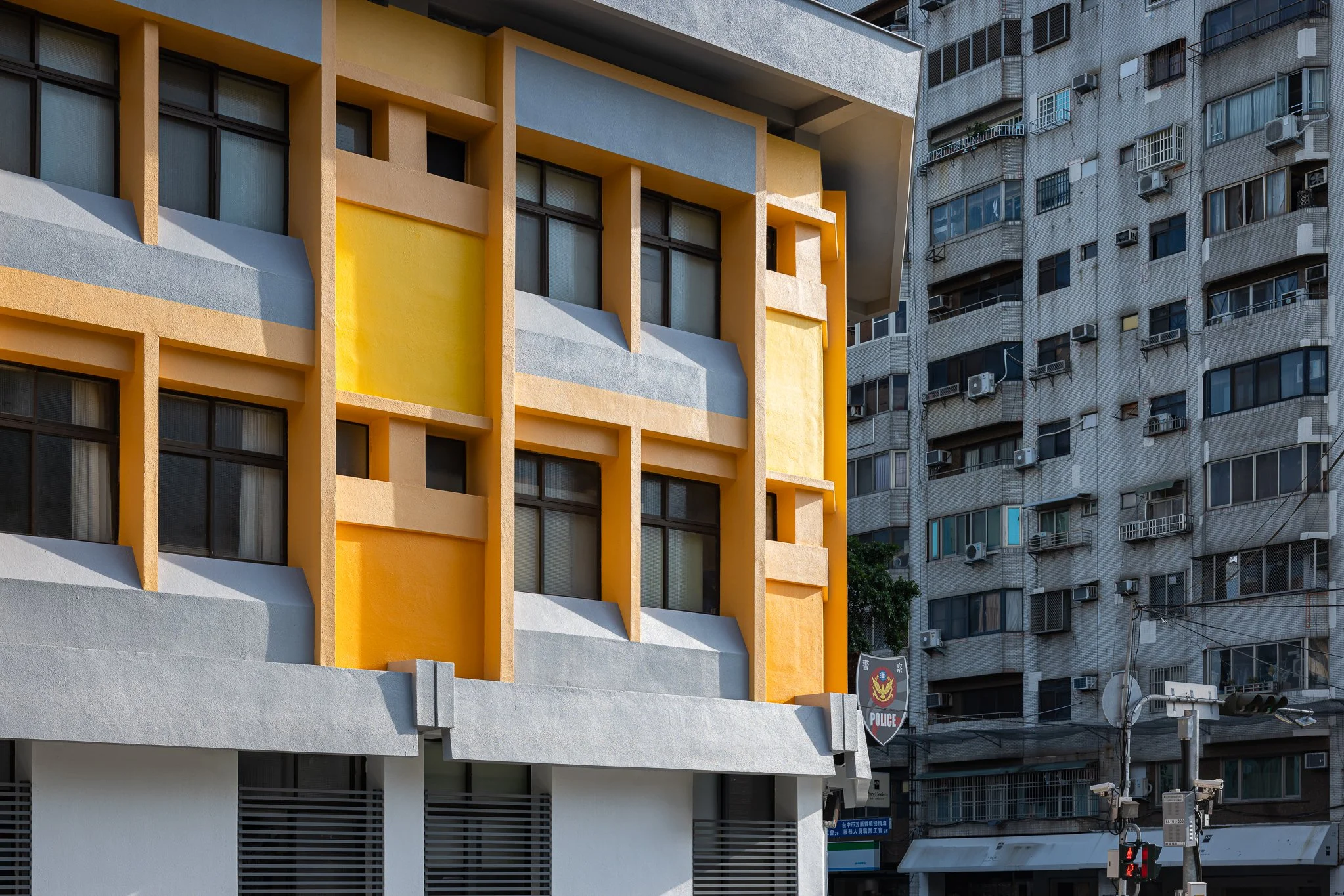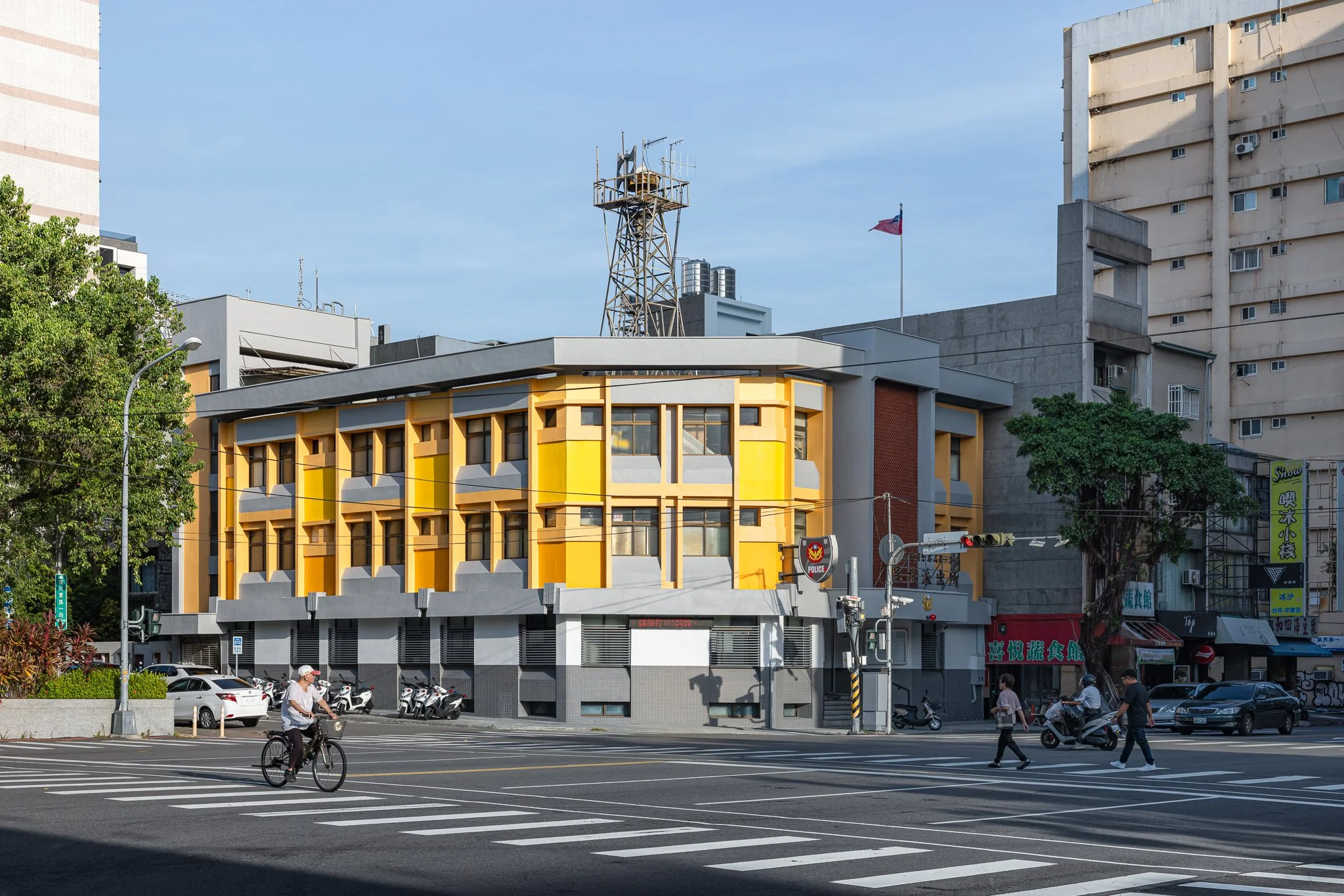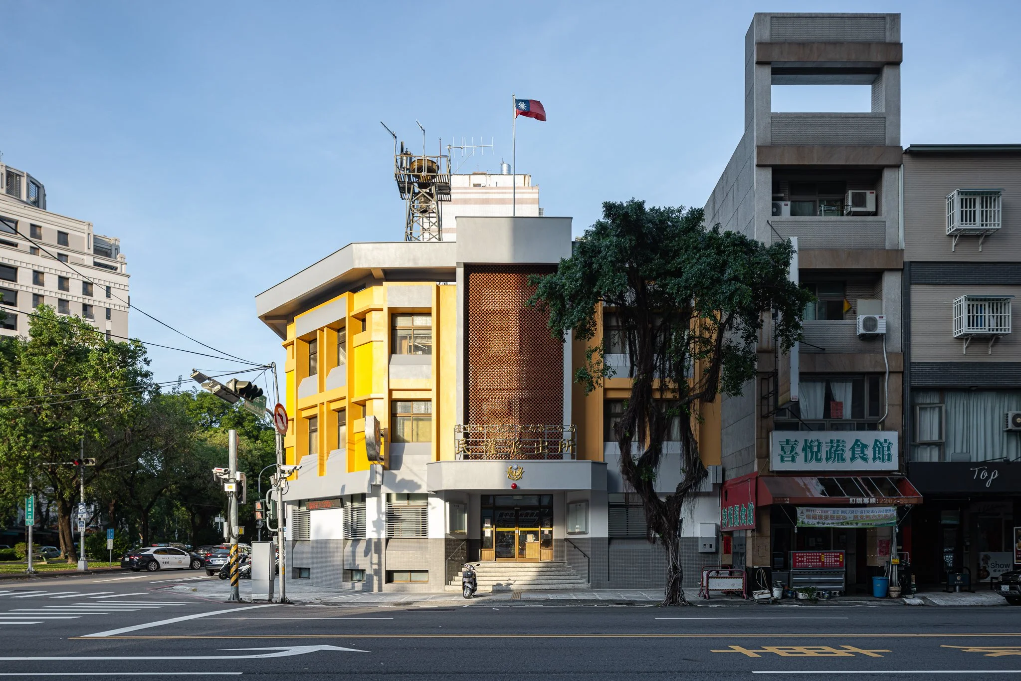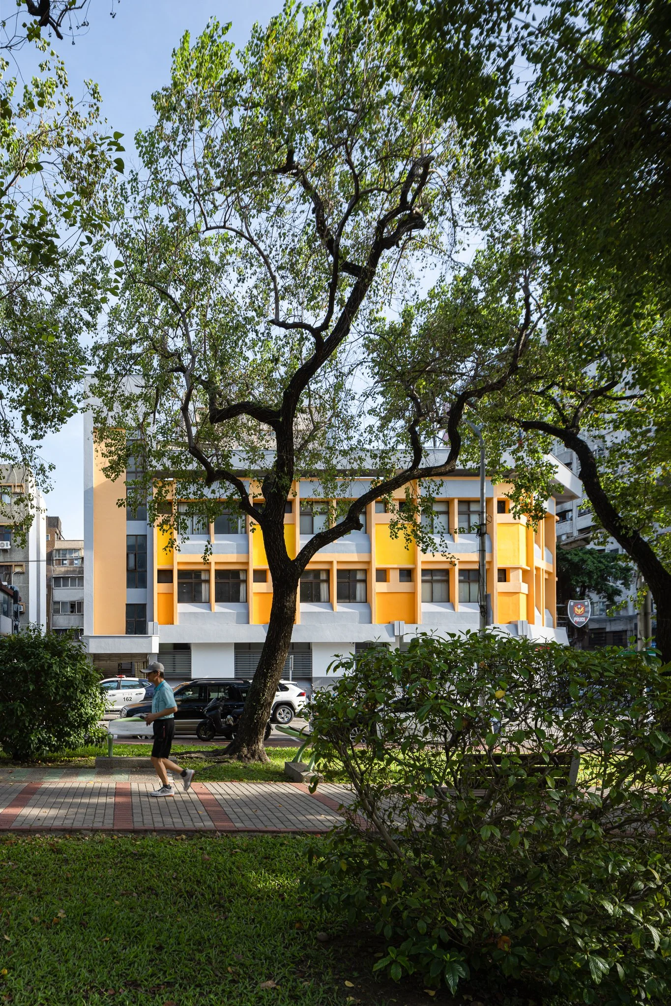 Taichung is a city defined by interconnected green corridors and river systems. Located along the Meichuan Greenway, Minquan Police Station sits within a key pedestrian link between the National Taiwan Museum of Fine Arts and the Taichung University of Education district. Due to aging exterior tiles, this renovation addressed safety concerns while reestablishing the building’s relationship with the surrounding landscape. The façade draws inspiration from the Chinese tallow trees in front of the site—their canopy height and autumnal yellow tones—allowing the building to act as a subtle backdrop to the greenway. Divided by the first-floor canopy, the lower level reorganizes tiles and security grilles into a clear horizontal expression, while the upper level introduces a vertical yellow gradient echoing the tree canopy. A fiberglass mesh overlay system was applied over the existing tiles to shorten construction time and minimize disruption, enabling the building to renew its civic presence while reconnecting with the urban landscape.