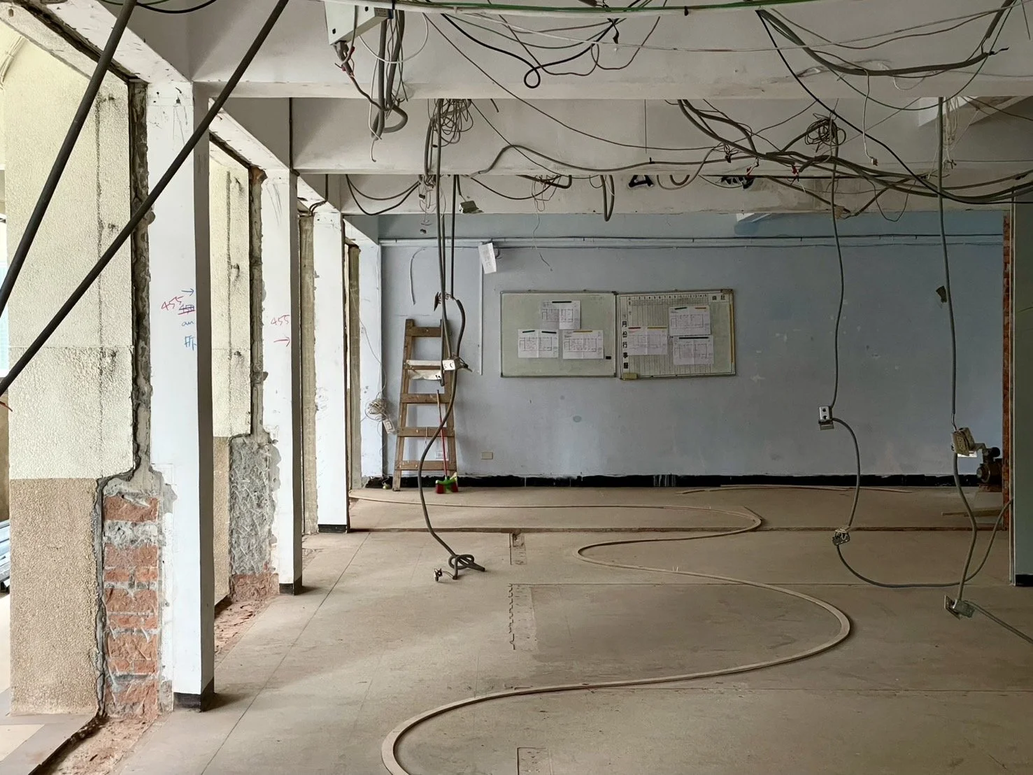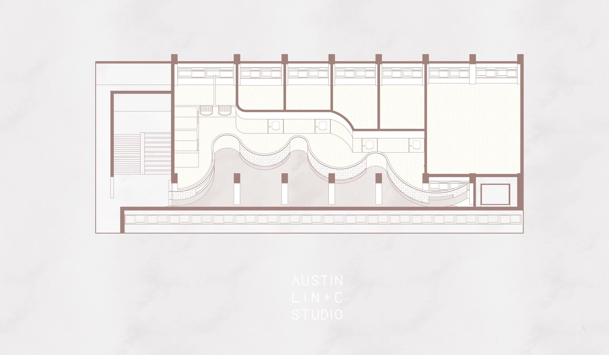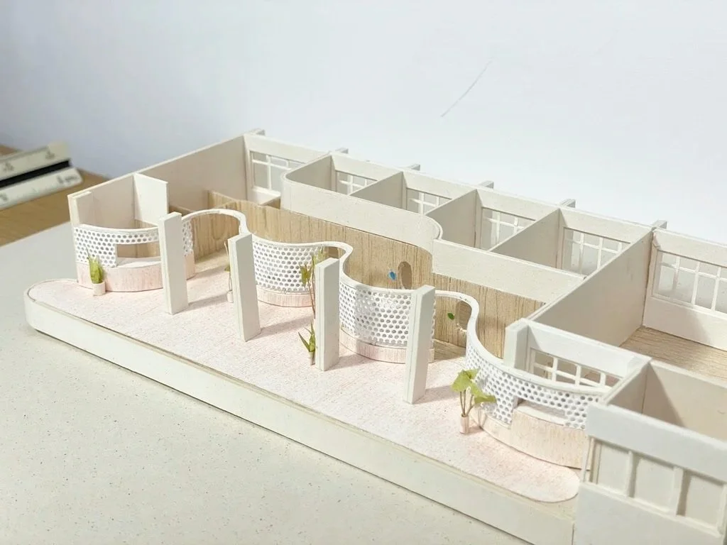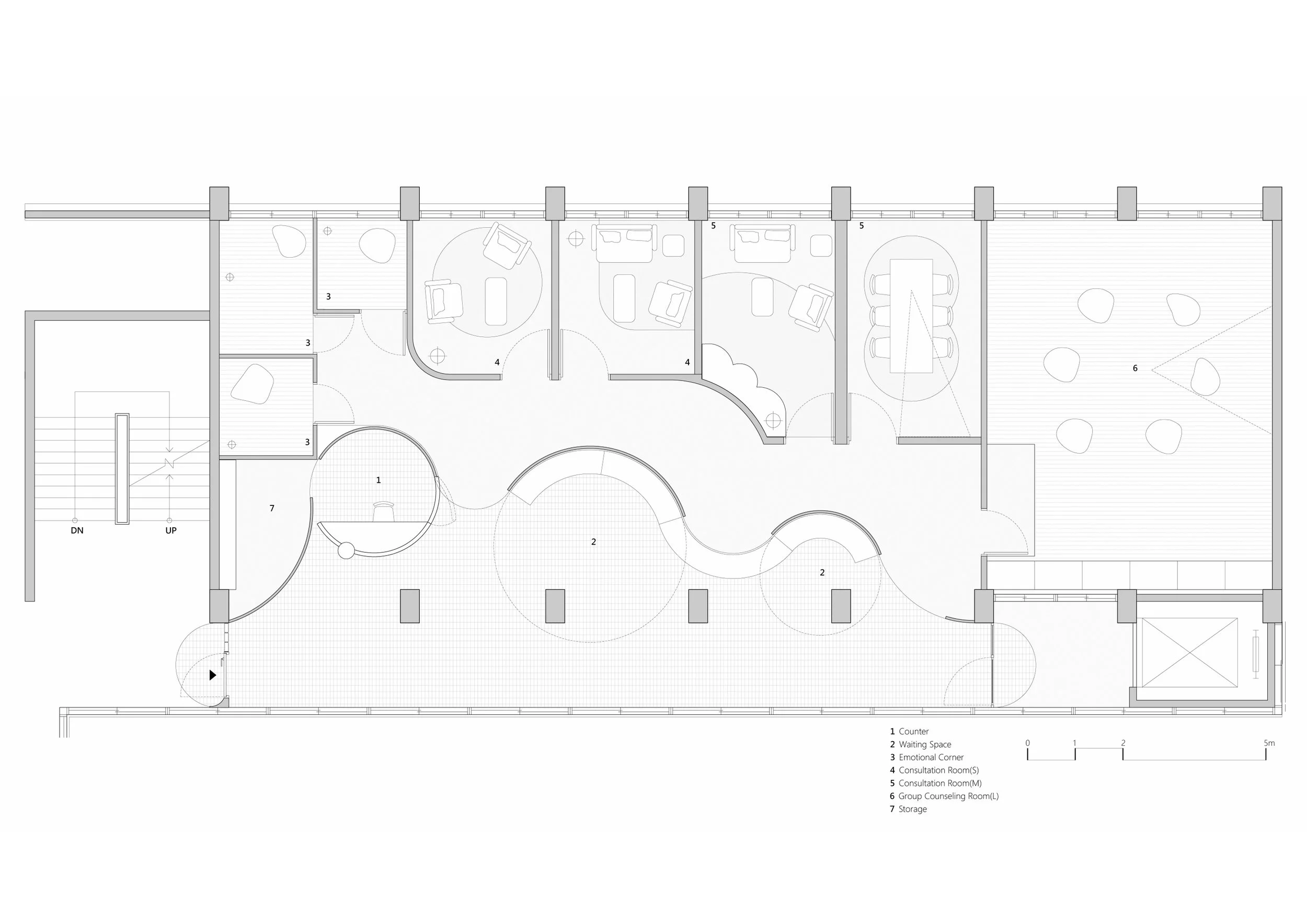 基地位於新北市東南科技大學自強樓三樓,本案旨在將傳統封閉的諮商室轉化為一個學生在日常即可自然使用的心靈休憩空間,使心理支持成為校園生活的一部分,而非特定時刻才啟動的行為。設計上打開原有阻隔南北向的牆面,引入南向光線與自然通風,並以弧線語彙柔化既有僵直的空間界面,創造更具停留與交流可能的環境。透過走廊、半私密中介區至諮商室的層次配置,形塑漸進式的空間轉換,使學生能依自身需求選擇參與的深度,在獲得情緒緩衝的同時降低標籤化壓力。圈圈話的核心在於將選擇權交還給使用者,讓心理支持以開放、可親近且生活化的方式存在於校園之中。