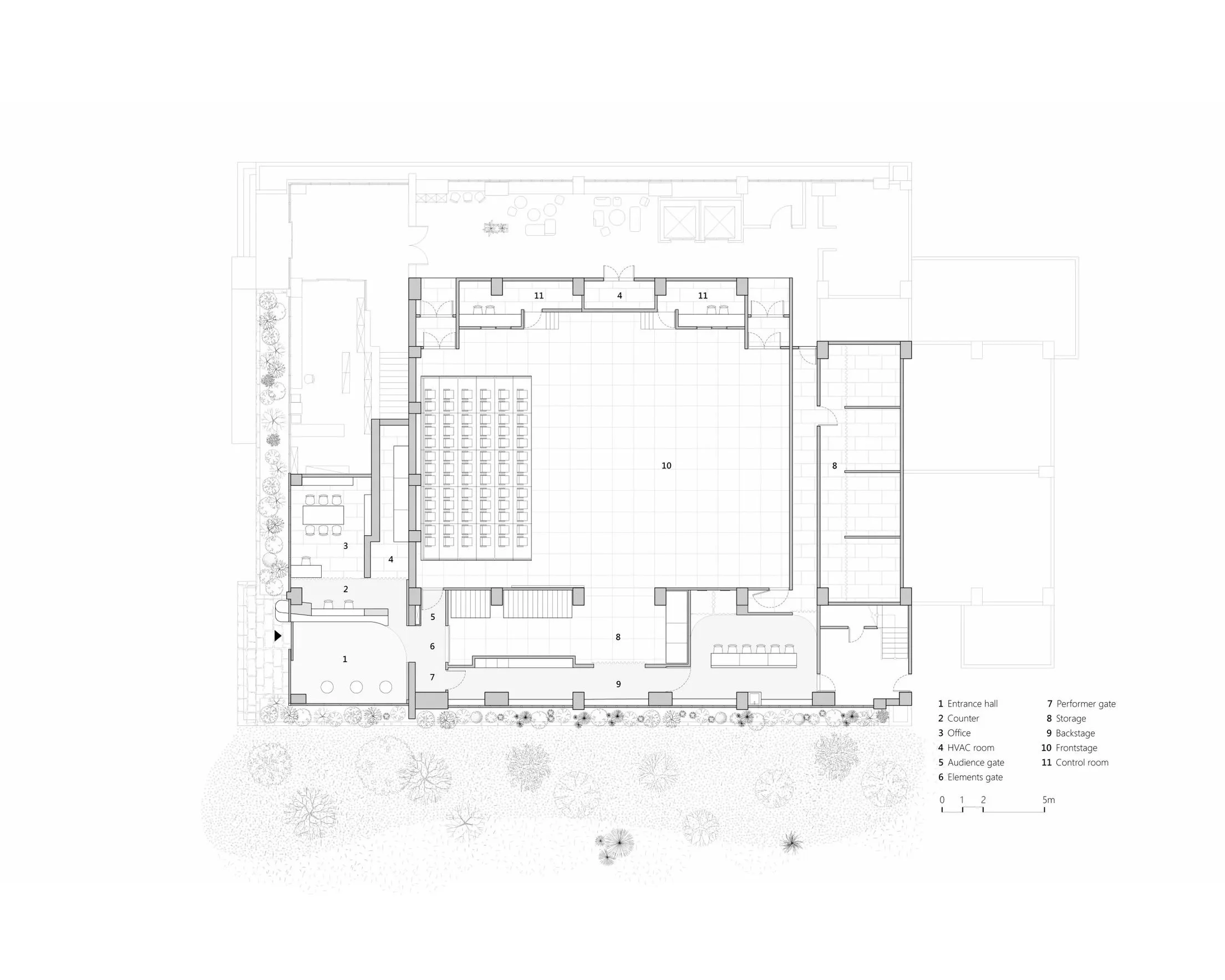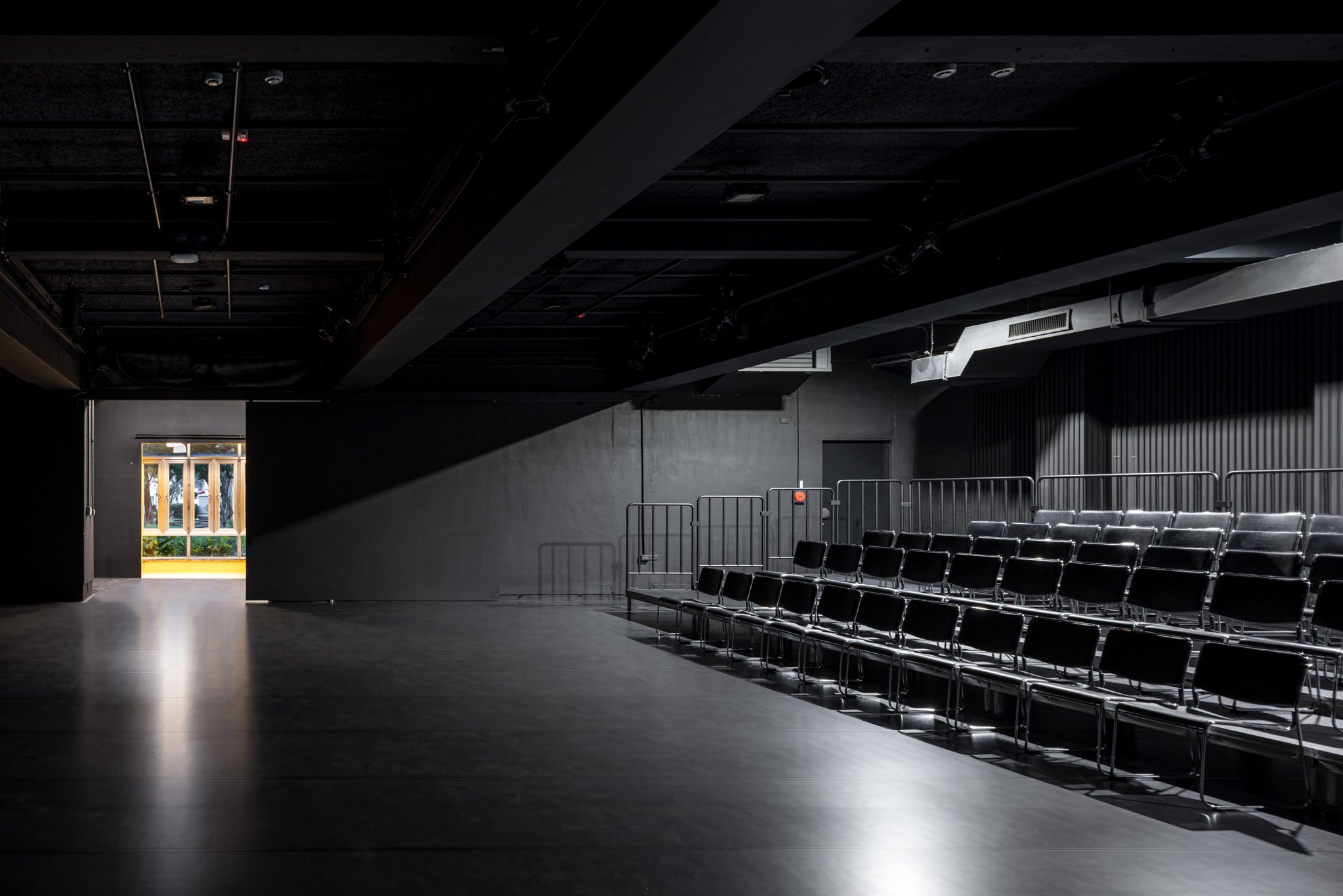 Located on the first floor of Shude Hall at Fu Jen Catholic University, the “Huaguan Theater” was formerly known as the Litu Theater. Its traditional proscenium stage could no longer meet the growing diversity of performance needs. The renovation transforms the space into a black-box theater, reconfiguring and integrating functions to support more than six types of performances, while seamlessly connecting with campus life and presenting a renewed architectural identity.