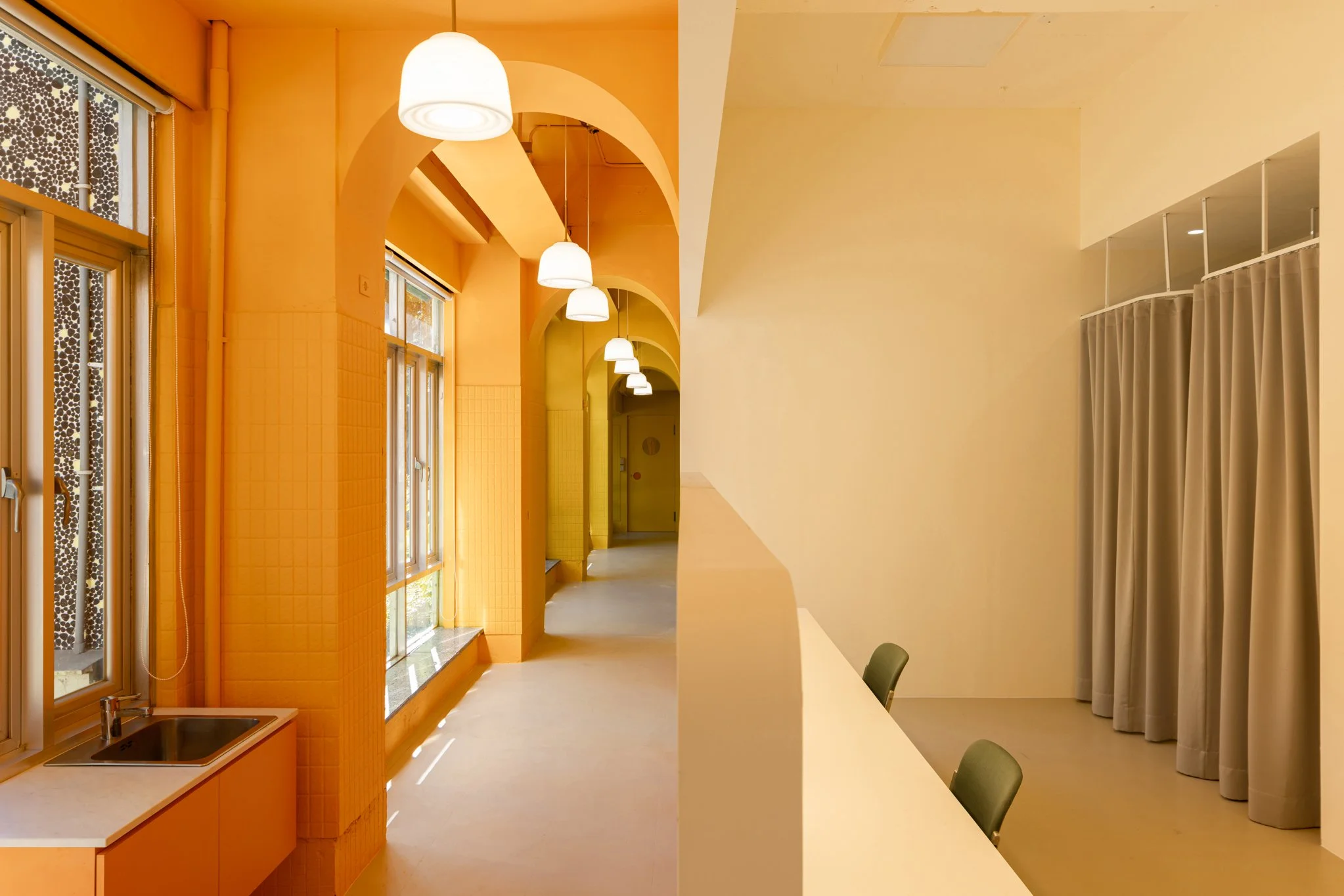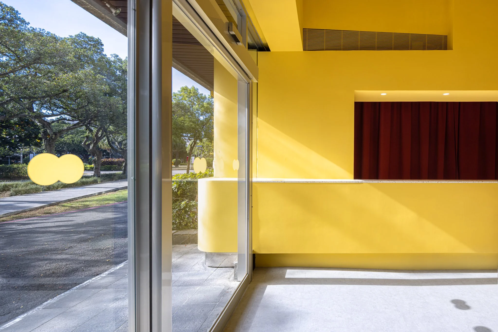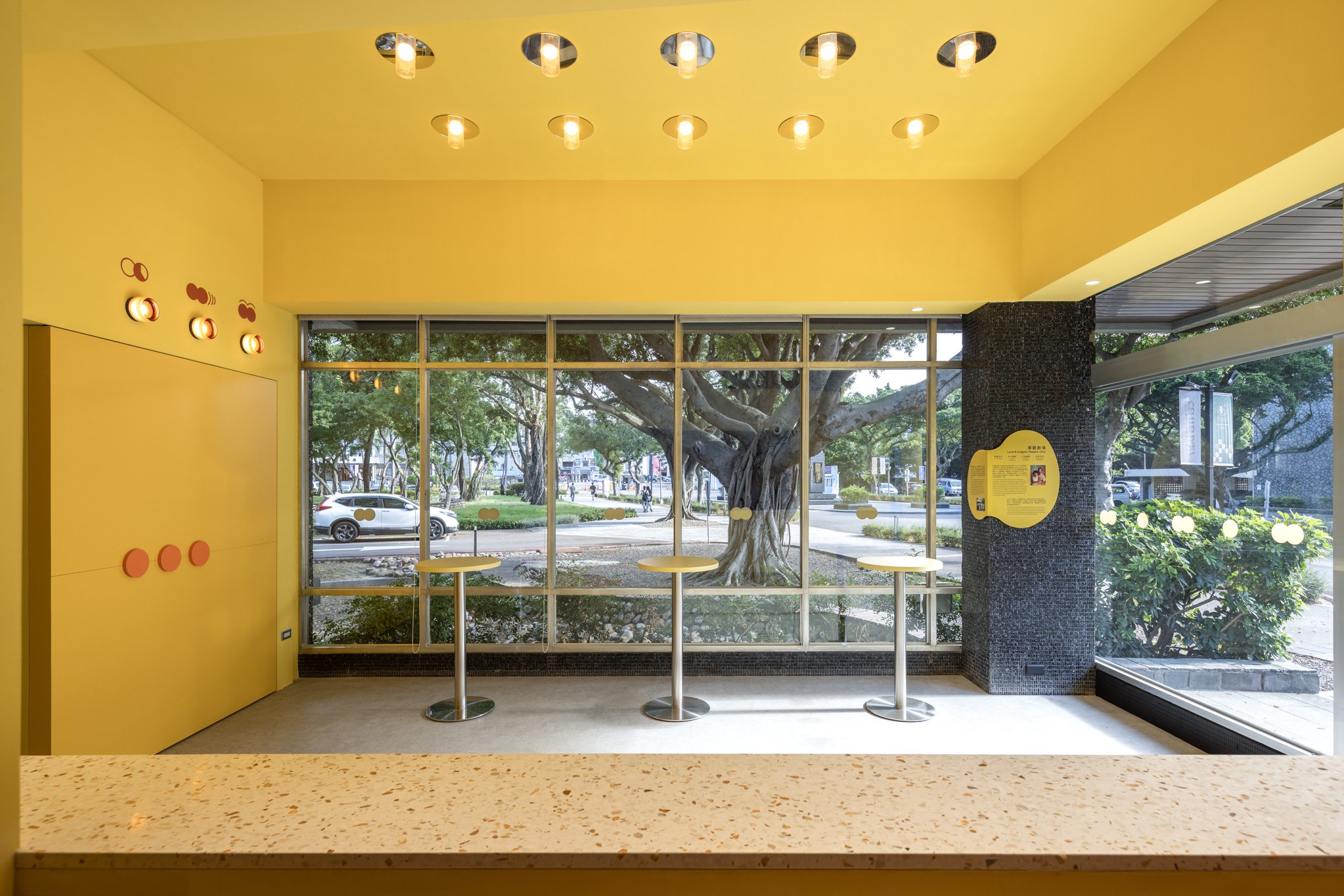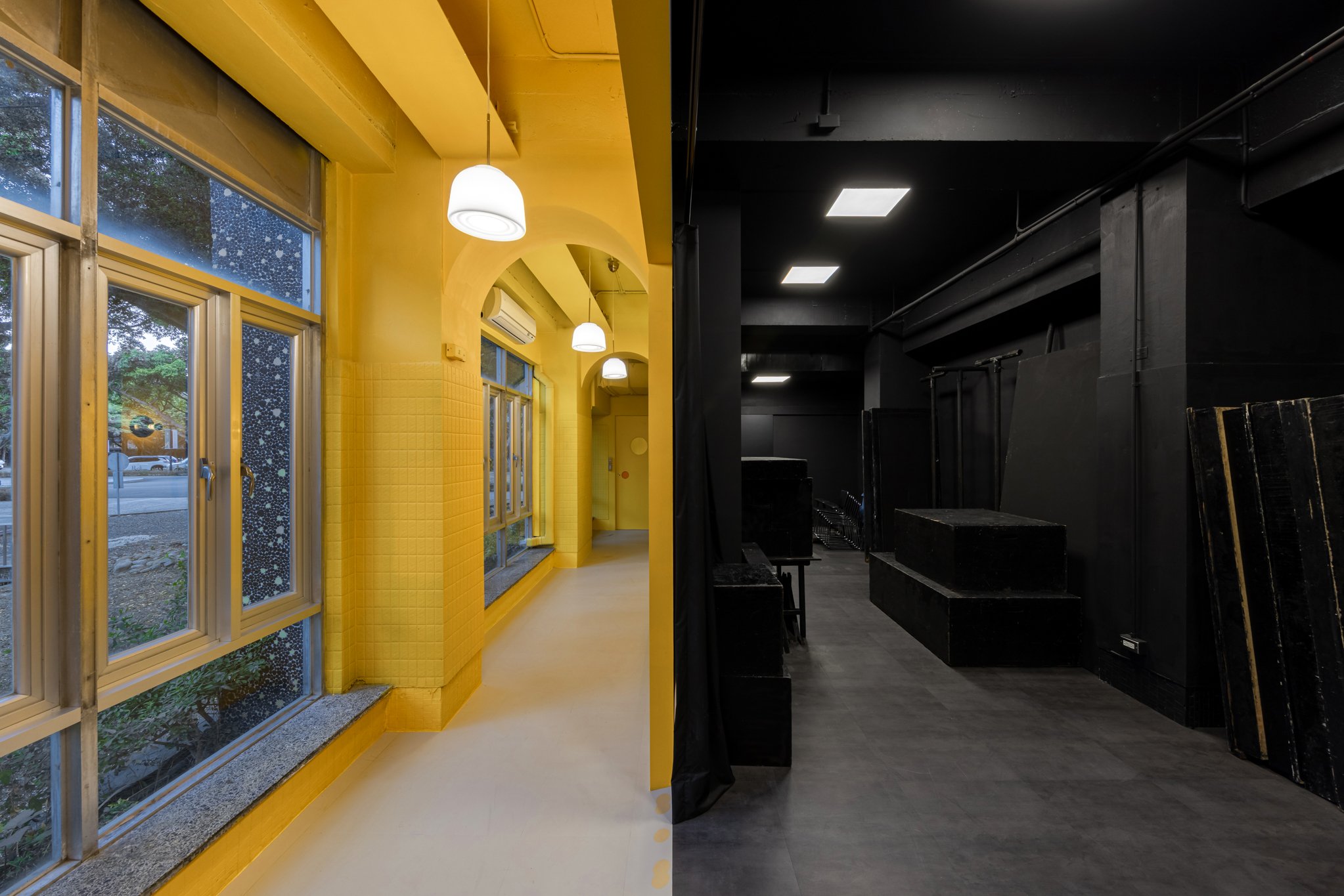 我們不僅希望觀眾在進場後才感受到戲劇張力,更思考如何讓劇場自然融入校園日常。設計上,將原本隱藏於建築深處的後場翻轉至臨窗,並透過色彩設計與立面融合,營造如同櫥窗般的視覺效果。當演員進入準備時,表演便已悄然展開,使老舊建築展現出新的活力。