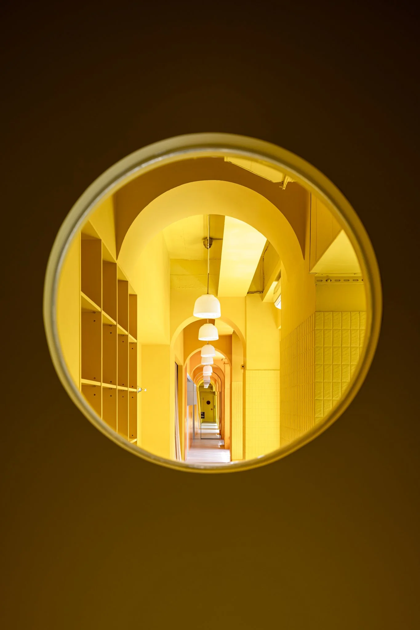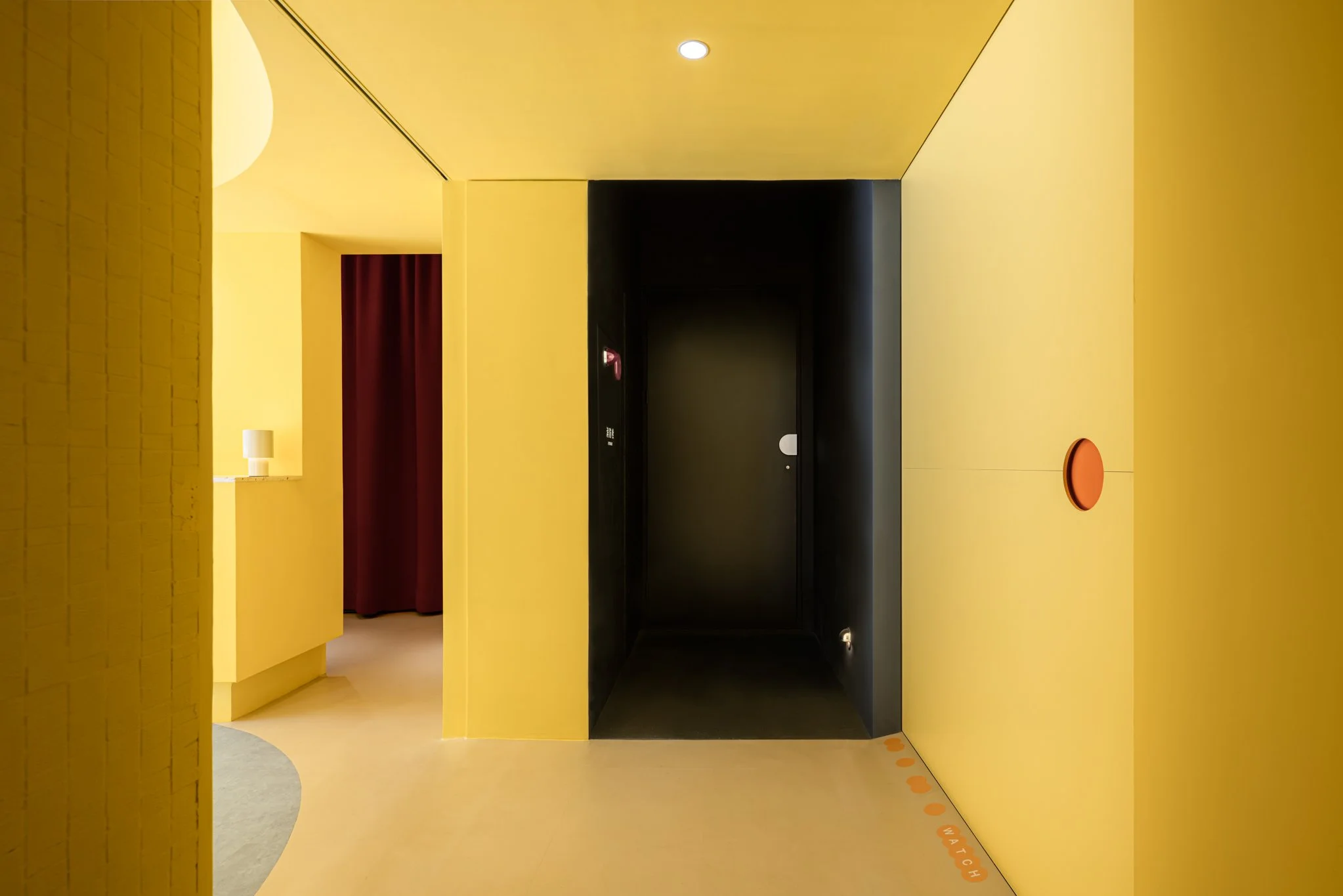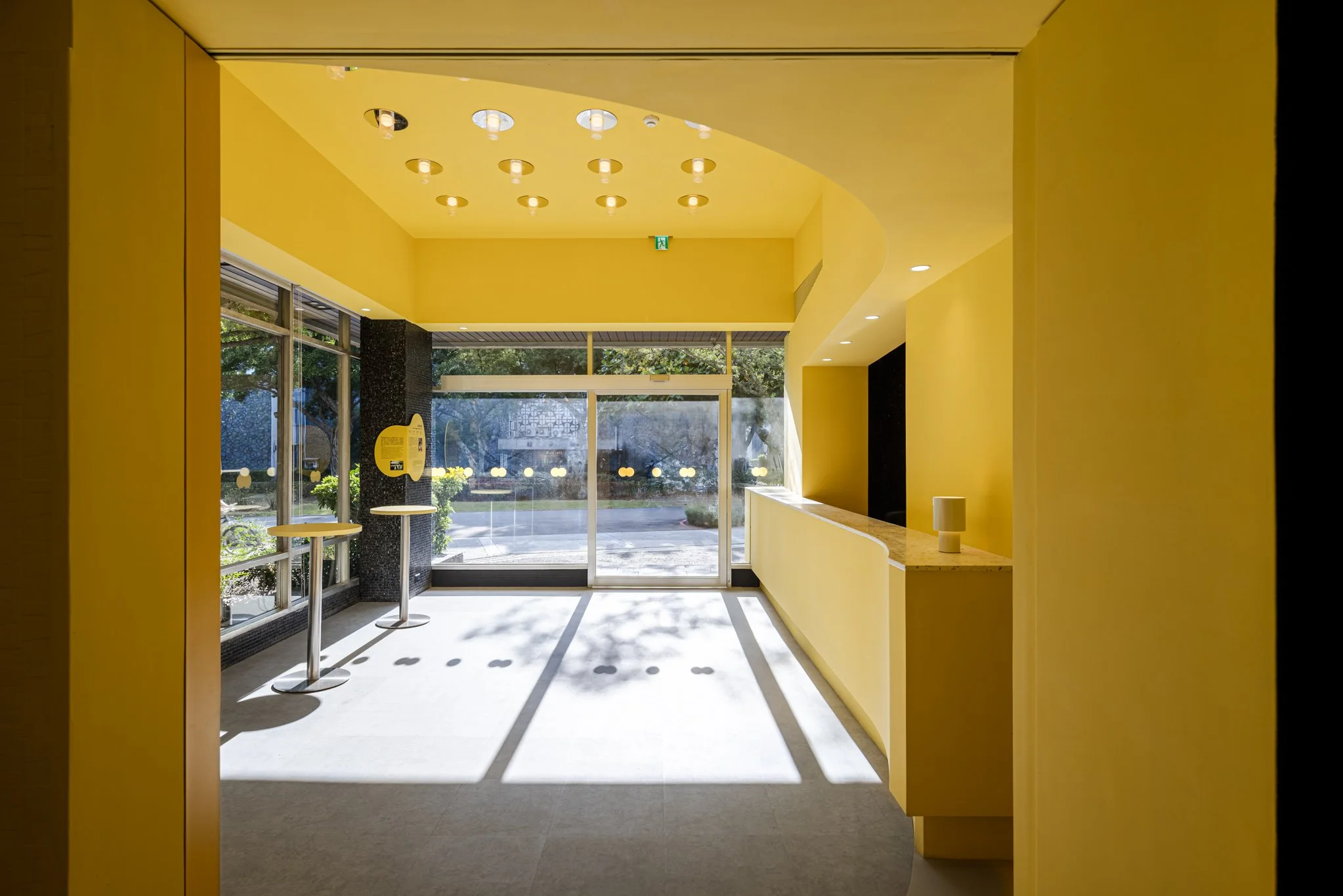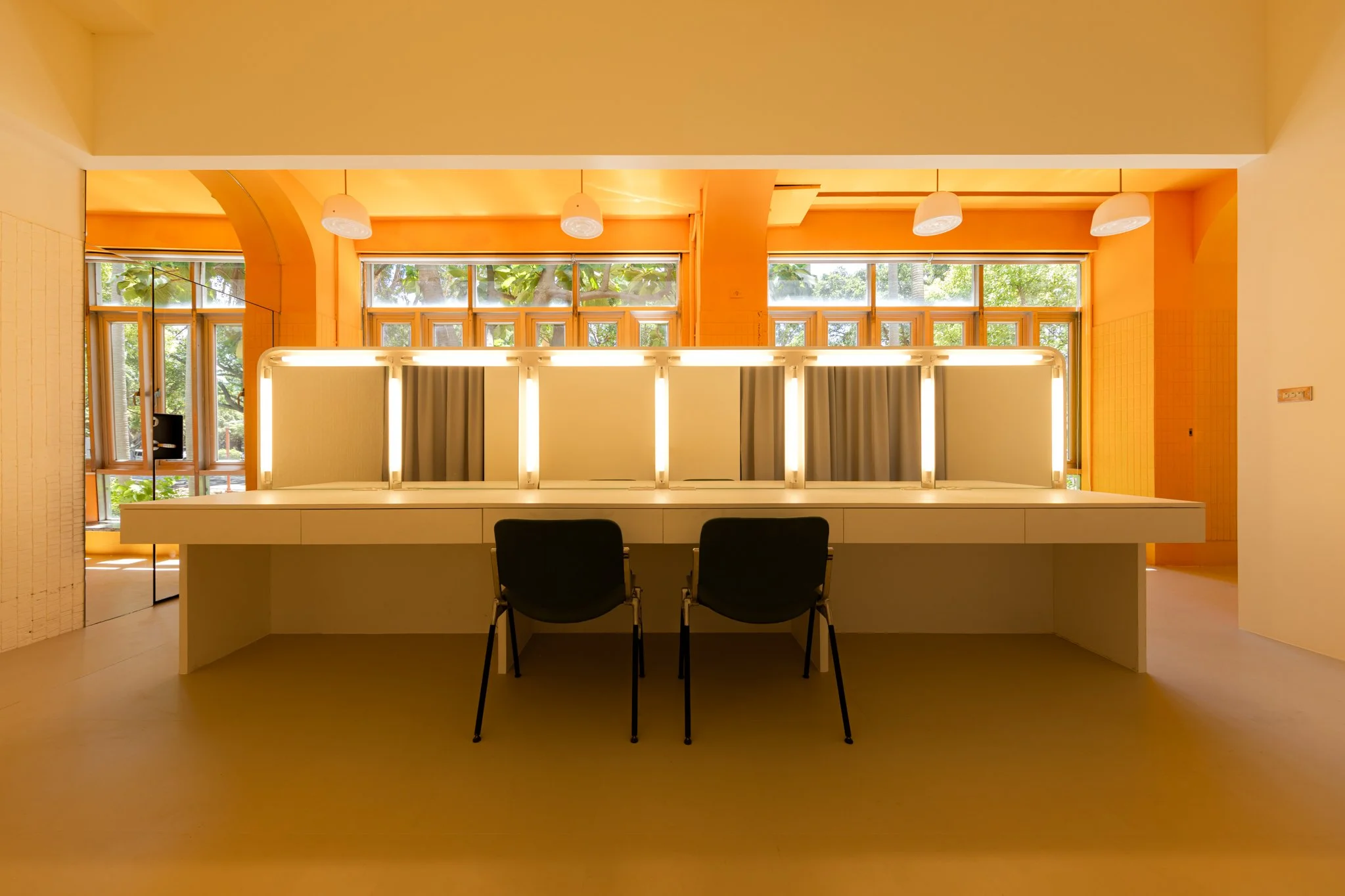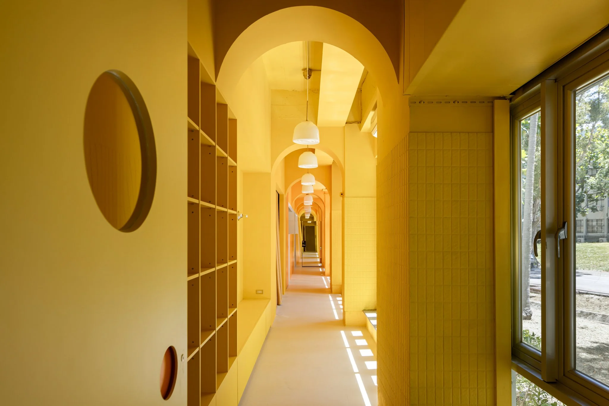 我們不僅希望觀眾在進場後才感受到戲劇張力,更思考如何讓劇場自然融入校園日常。設計上,將原本隱藏於建築深處的後場翻轉至臨窗,並透過色彩設計與立面融合,營造如同櫥窗般的視覺效果。當演員進入準備時,表演便已悄然展開,使老舊建築展現出新的活力。