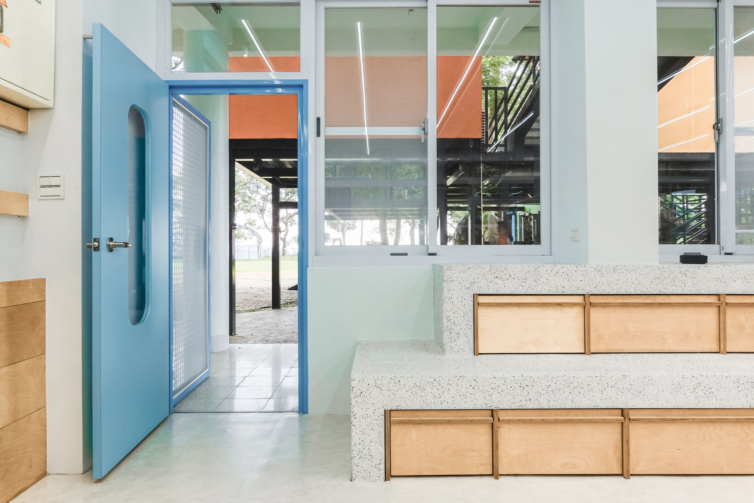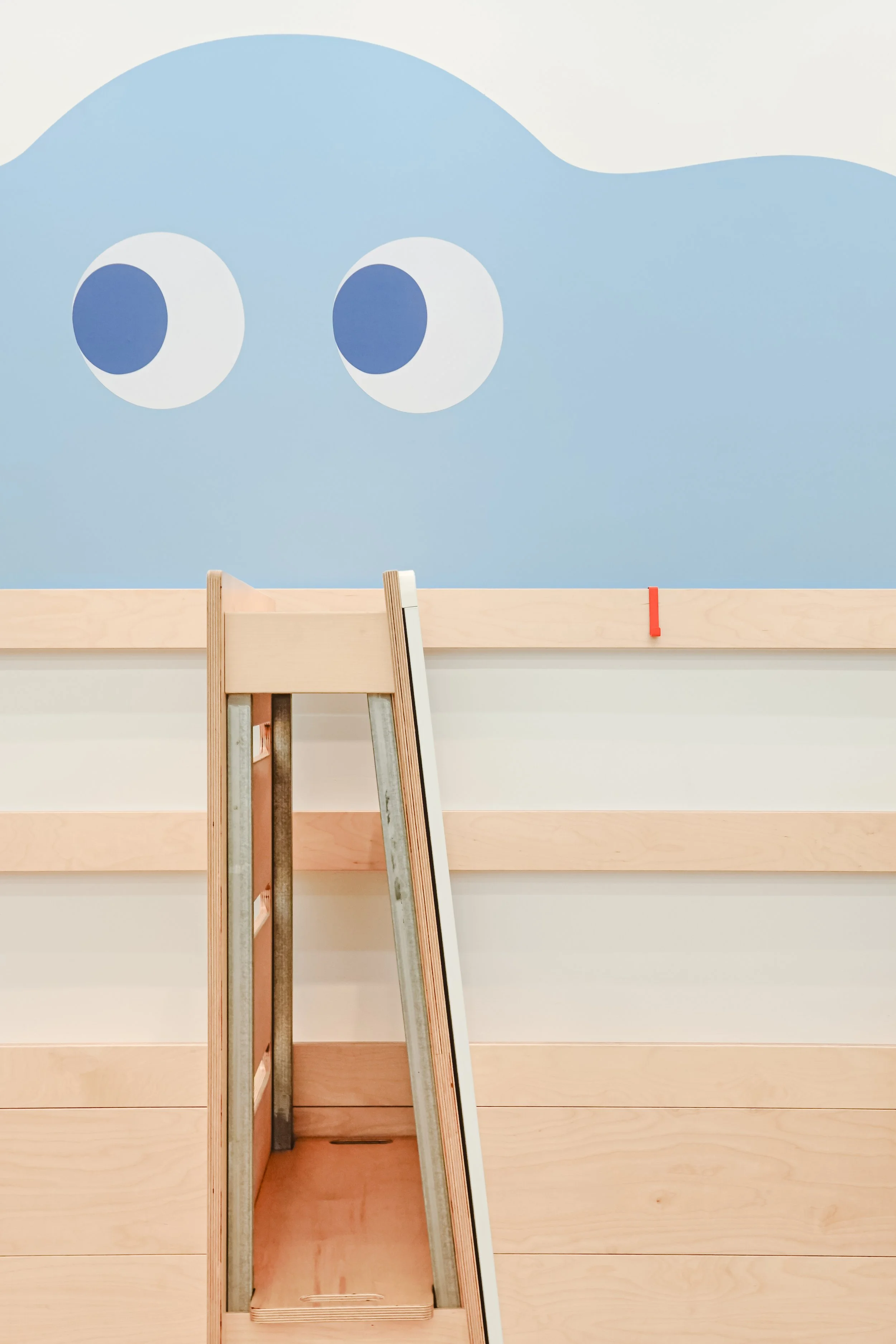 這是一間不一定要從門口進入的教室,你可以爬行的姿態進入,透過不一樣的身體行為感受,我們要你知道:這不是一般的教室,而是想法放大室。